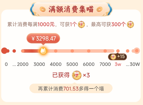累计消费满1000元得1个喵,最高可以获得300个。(也就是消费30万拿满)