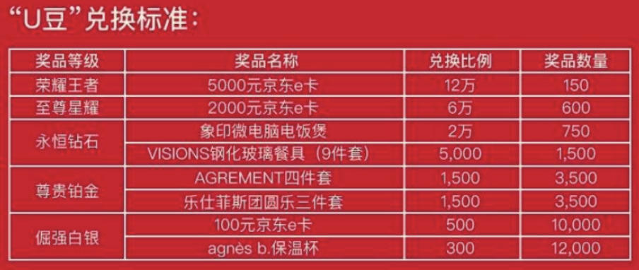 率先获得2万个U豆的前50名奖励500元京东E卡(即消费20万元)。需要一过零点就达标,否则没戏。
