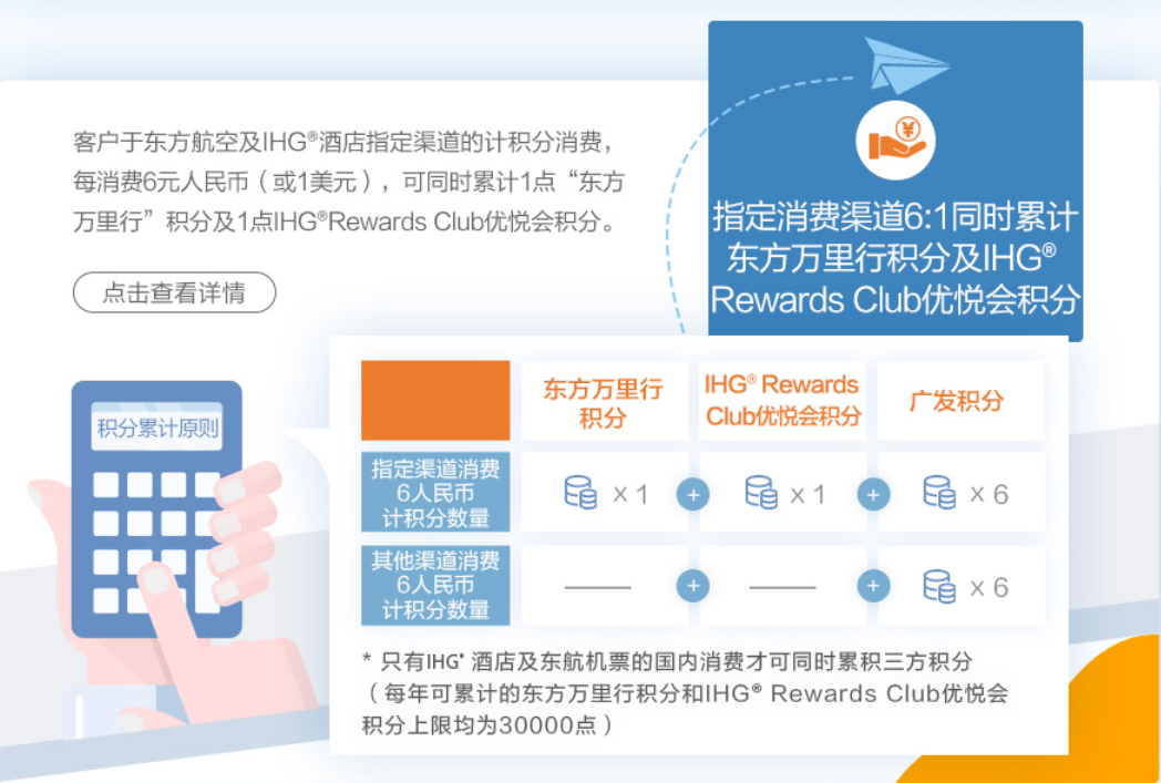 1,东航或IHG指定渠道每消费6元,可同时累积1点东航积分+1点IHG积分+6点广发积分。每年上限3万点,即记积分消费上限18万元。