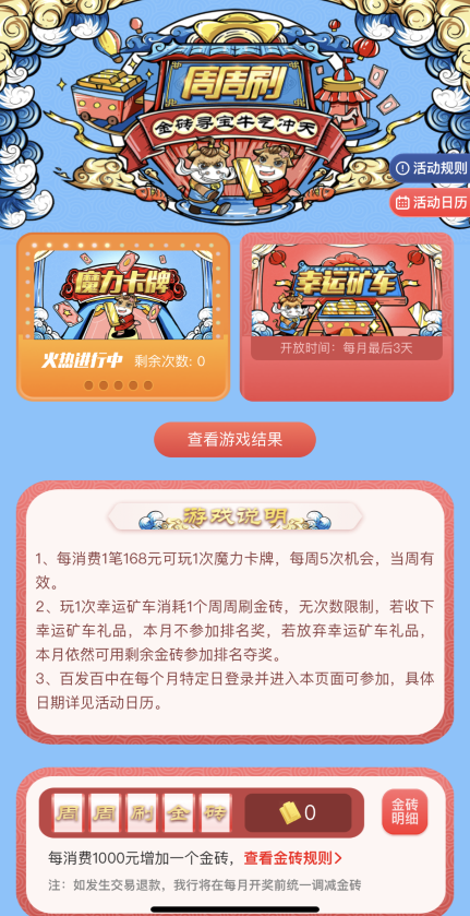 老活动,每月记积分消费28888元和每月16天交易满88元,这两个活动,抽奖。可以玩到12.31,之后再看续不续。