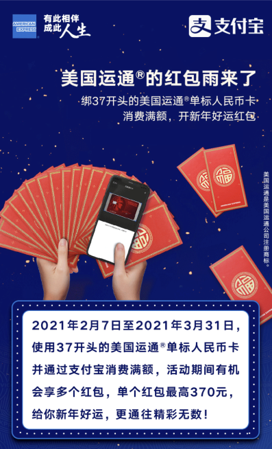 1,37开头的运通卡,每天用支付宝消费一笔37元以上,最高可得370元红包!注意每天名额只有8万名,所以还得早点消费。