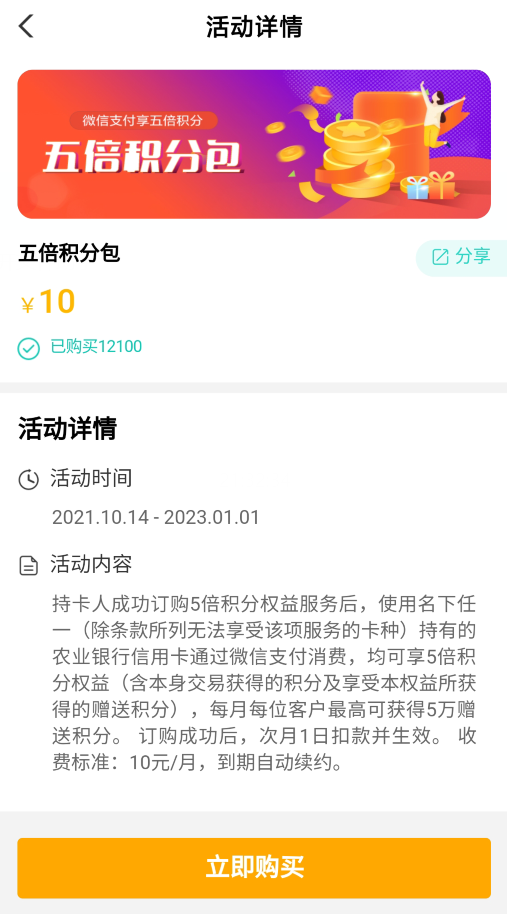 路径:农行APP-首页-信用卡-权益精选-五倍积分包