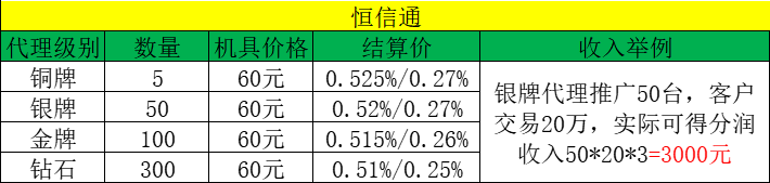 2024.5.1号起,注册满360天的代理商pos交易成本上调0.005%,pos手机钱包、银联jspay结算成本上调0.01%,商户费率保持不变。