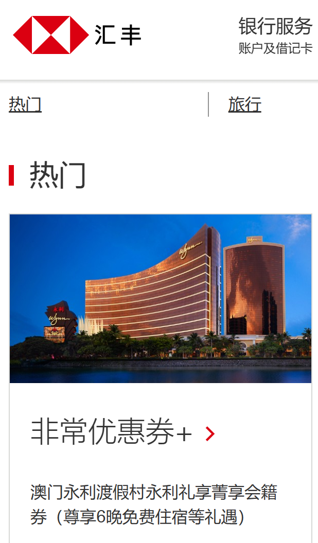 - 持卡人可在“信用卡”-“非常优惠券+”-“我的券包”中查看已领取的优惠券。请按照预约时间到店,向前台出示电子邀请码,并持名下汇丰中国卓越理财旅行信用卡进行预授权,即可兑换永利礼享菁享会籍,享受相关礼遇。