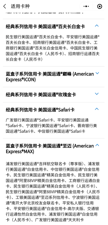 首先你需要有一些运通卡,常见的比如浦发AE白、平安Safari、招行百夫长等等,具体看截图,适用的卡种还挺多的。