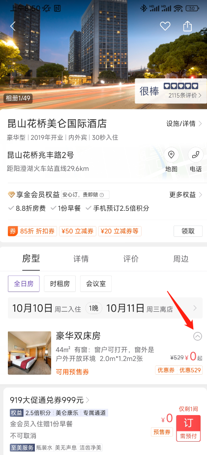 3,输入城市,比如我们输入昆山,就看到有一家酒店可以用。点击如图所示的箭头,就可以展开所有房型。